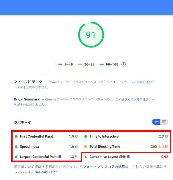 50点が中央値で、50点以上なら世の中のサイトのページ表示速度より速いページであるという評価になるそうです。