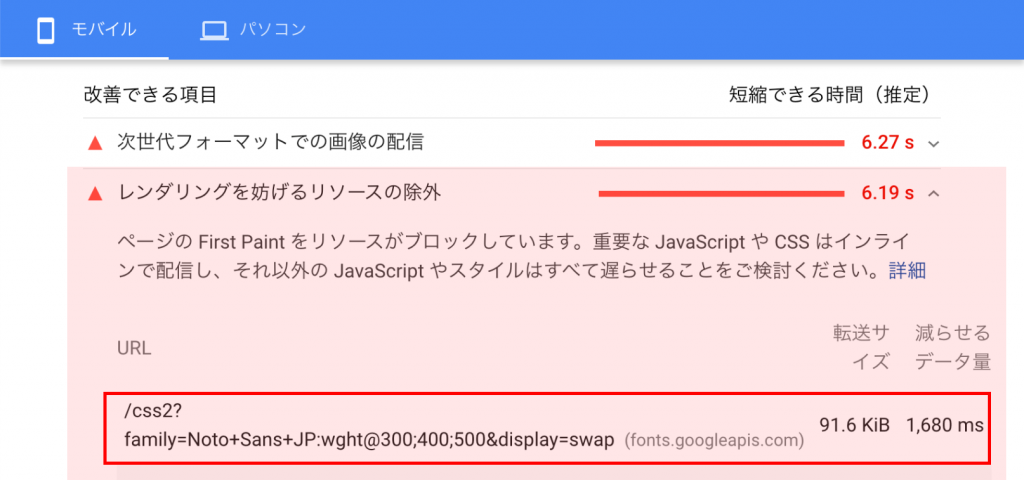 結論から言うと、今回サイトの表示スピードの評価を著しく下げていた原因はこの「Noto Sans JP」でした。