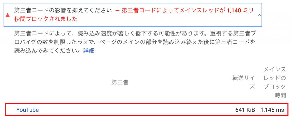 Youtubeの埋め込みにしていましたが、診断結果の改善項目を見ていると