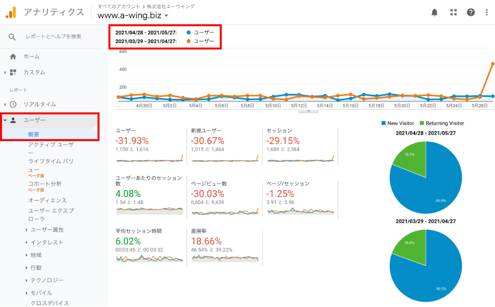 先月と比べ新規ユーザーが減少しているという現状が分かります。 - ウェブサイトにユーザーが関心を持ったか判断できる「直帰率」