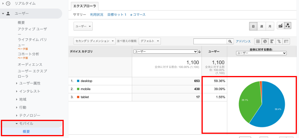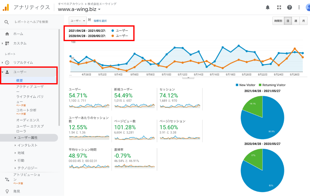 左側メニューバー「ユーザー」→「概要」で大まかな数値を確認できます。