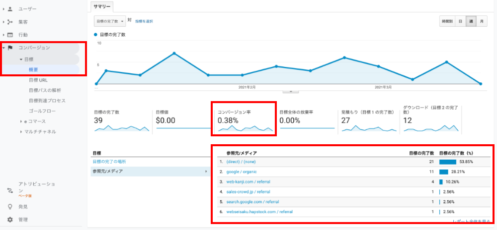 左側メニューバー「コンバージョン」→「目標」→「概要」でデータが確認できます。