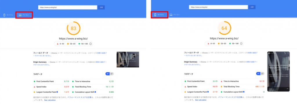 SEOの観点からも重要となりますので、こちらもGoogle先生が提供している「PageSpeed Insights」にてページ速度を計測できます。
