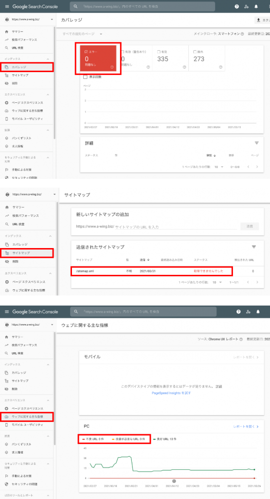まずは一通りエラーが出ていないか?出ている場合はそのエラーを対策してサイト改善に繋げられるので、