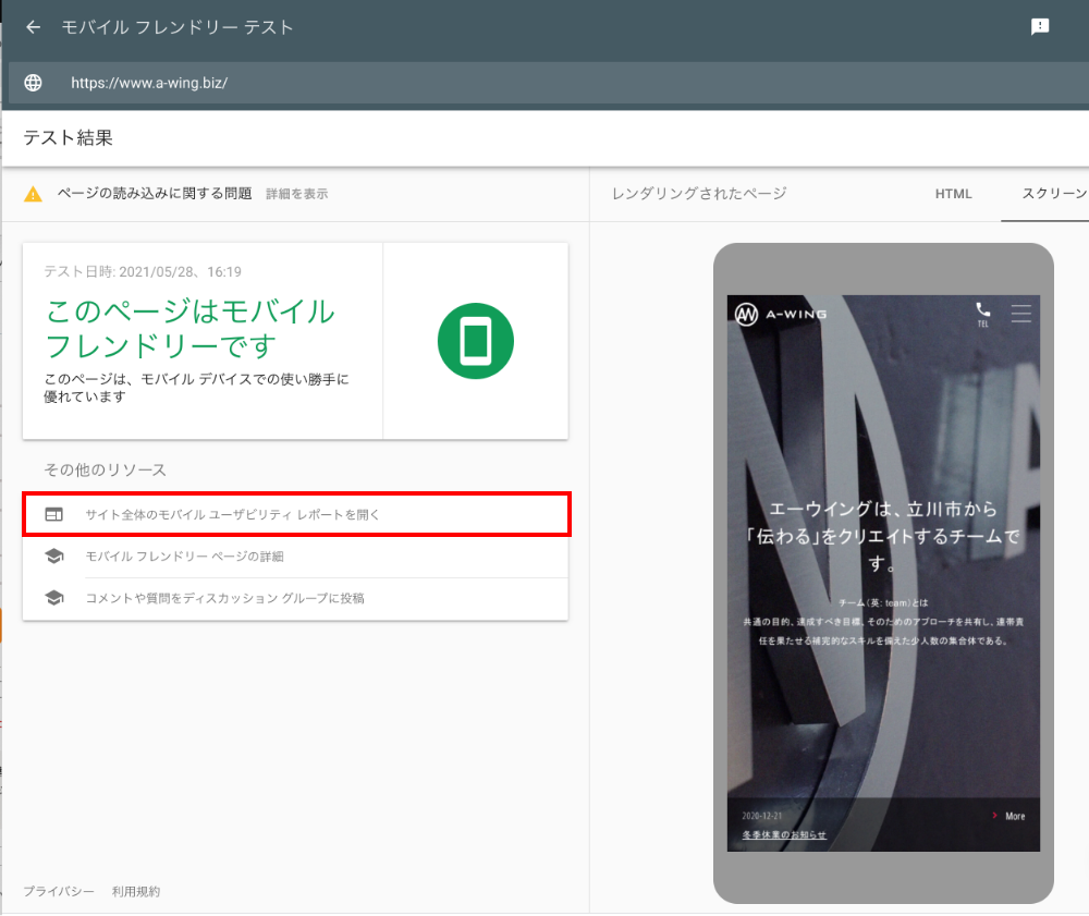 また、上図の赤い枠の「モバイルユーザービリティレポートを開く」をリンクすると