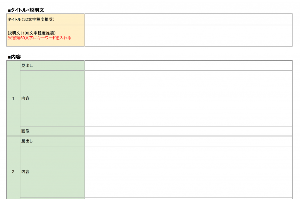 今回は上記ポイントなどを踏まえた記事作りができる雛形シートをご用意いたしました!