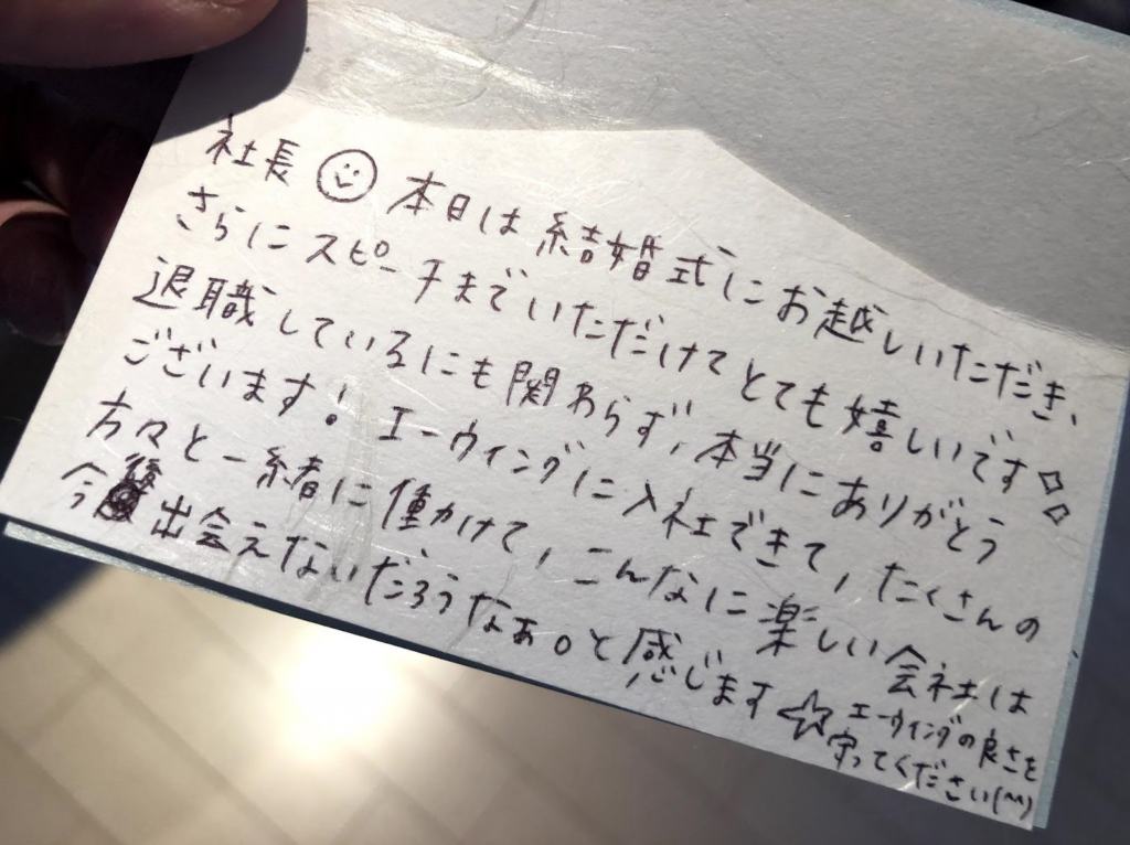そんな時、退職したクリエイティブ部リーダーから結婚式に招待されました。ありがたいことに、主賓で呼んでいただき挨拶もさせていただきました。その時に彼女からメッセージカードをもらいました。その中には「こんなに楽しい会社は今後出会えないだろうなと感じます。エーウイングのよさを守ってください。」とありました。