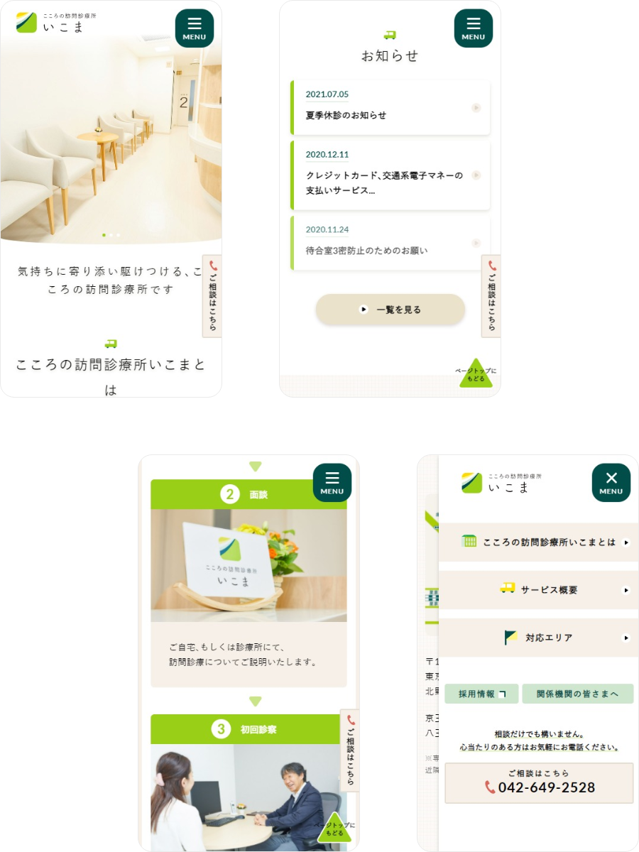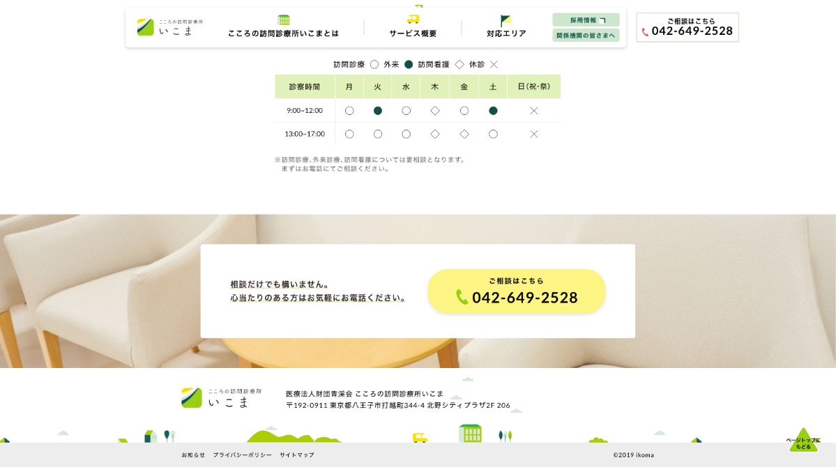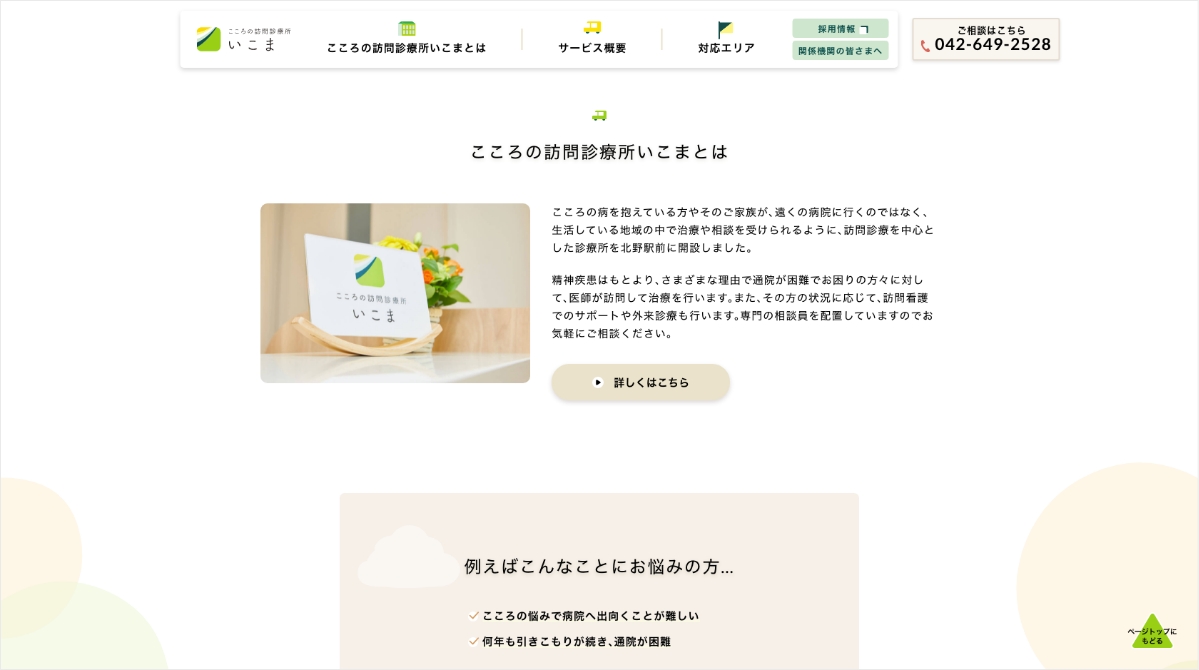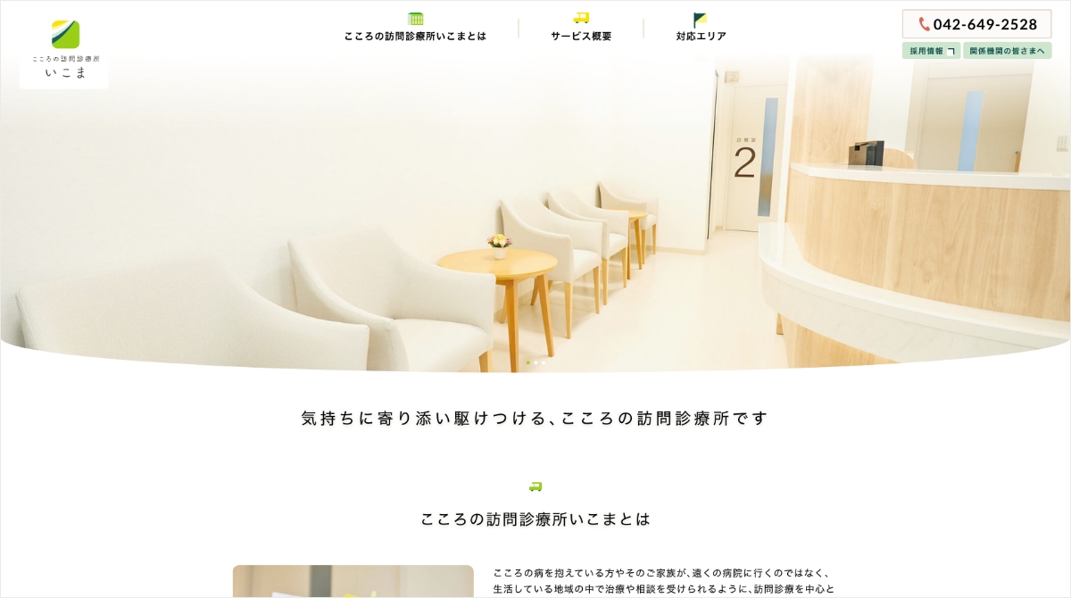 こころの訪問診療所 いこま SEIKEIKAI 気持ちに寄り添い駆けつける、こころの訪問診療所です 北野駅前にある訪問診療を中心とした診療所、いこまのオフィシャルサイトを制作しました。 INFOMATION CLIENT医療法人財団 青溪会 RELEASE2019 / 11 ~ VIEW WEBSITE CONTACT 制作に関するお問い合わせはこちら