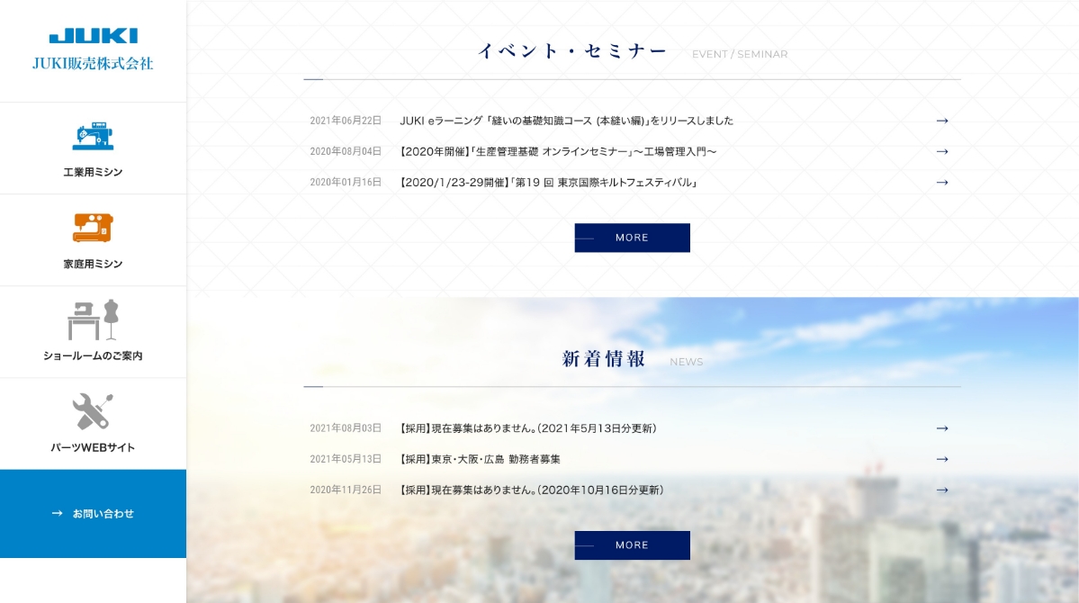 ミシンメーカーJUKIの日本国内の販売会社として日本国内での工業用ミシン、家庭用ミシン、職業用ミシンの販売・修理を主業務としています。 縫製工場様・アパレルメーカー様向けの設備やリフォームやギフトショップ関係、学校向け設備等にも対応。 全国に代理店(販売店)ネットワークで国内最大級の販売・修理サポートをご提供致します。