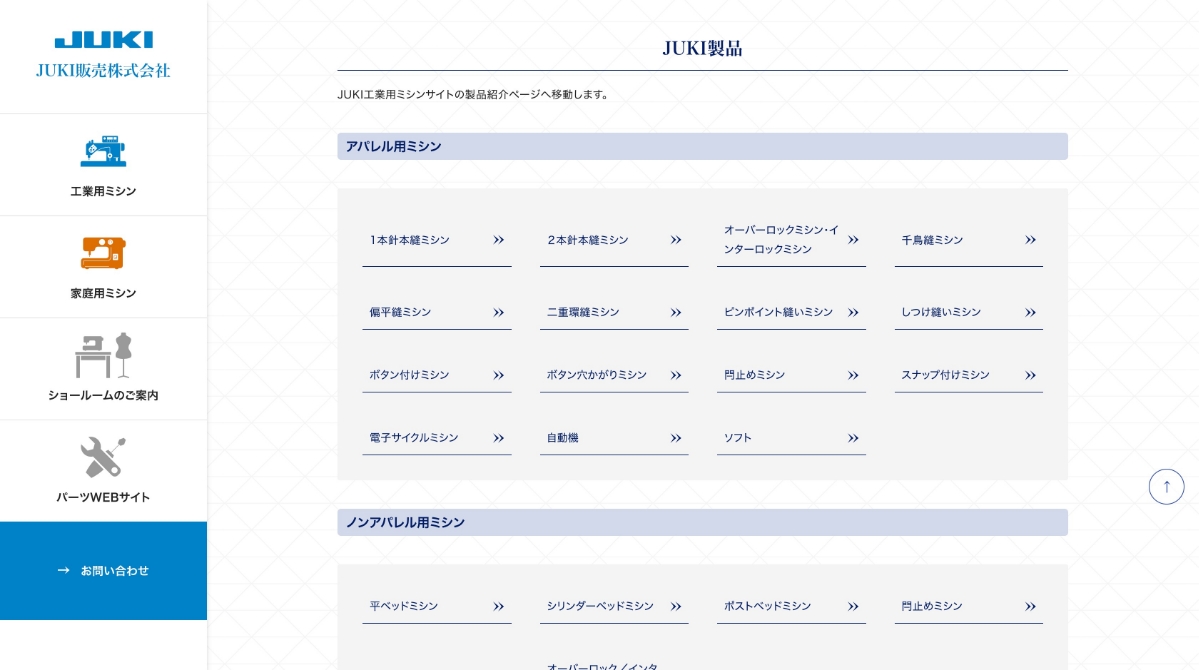 ミシンメーカーJUKIの日本国内の販売会社として日本国内での工業用ミシン、家庭用ミシン、職業用ミシンの販売・修理を主業務としています。 縫製工場様・アパレルメーカー様向けの設備やリフォームやギフトショップ関係、学校向け設備等にも対応。 全国に代理店(販売店)ネットワークで国内最大級の販売・修理サポートをご提供致します。