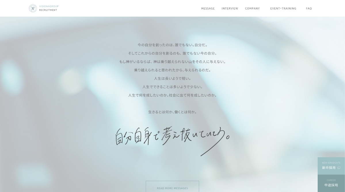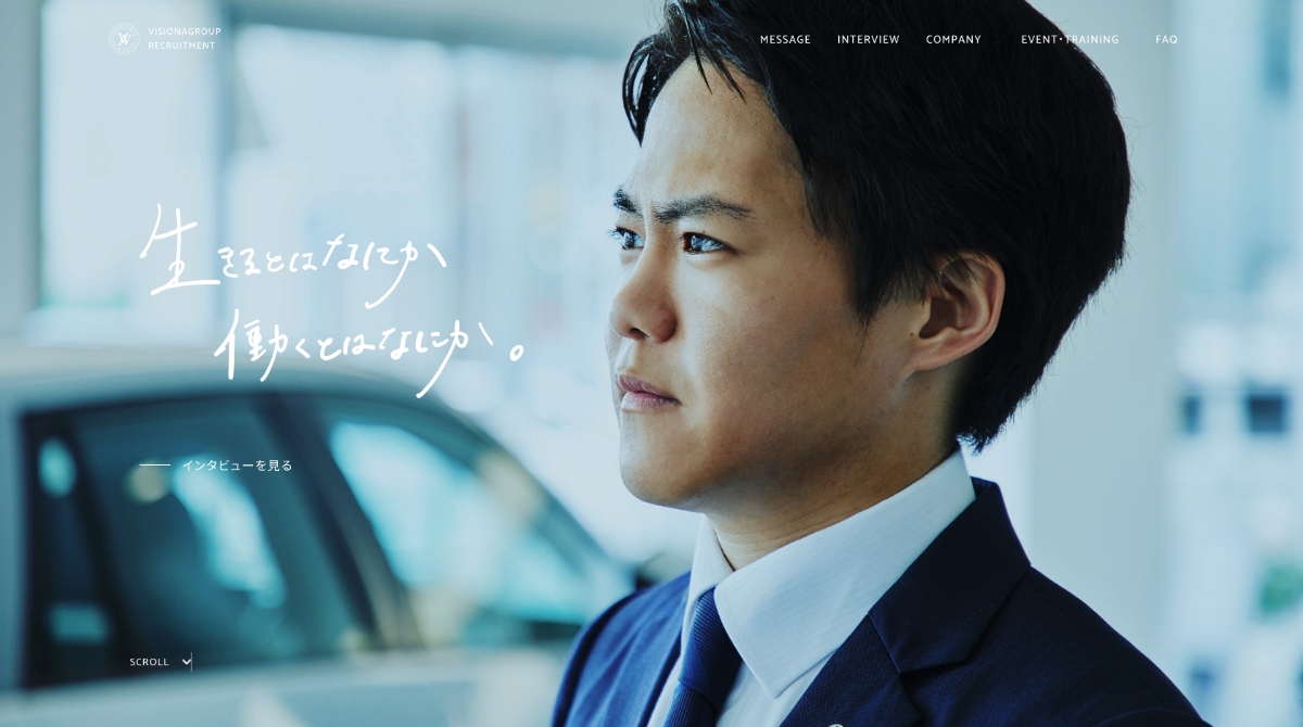 東京都多摩エリア、埼玉県所沢エリアを中心にディーラー事業・中古販売事業などを展開する、ビジョナグループの採用サイトを制作しました。 「生きるとはなにか、働くとはなにか。」というメッセージを、求職者に訴えかけることをデザインで表現しています。