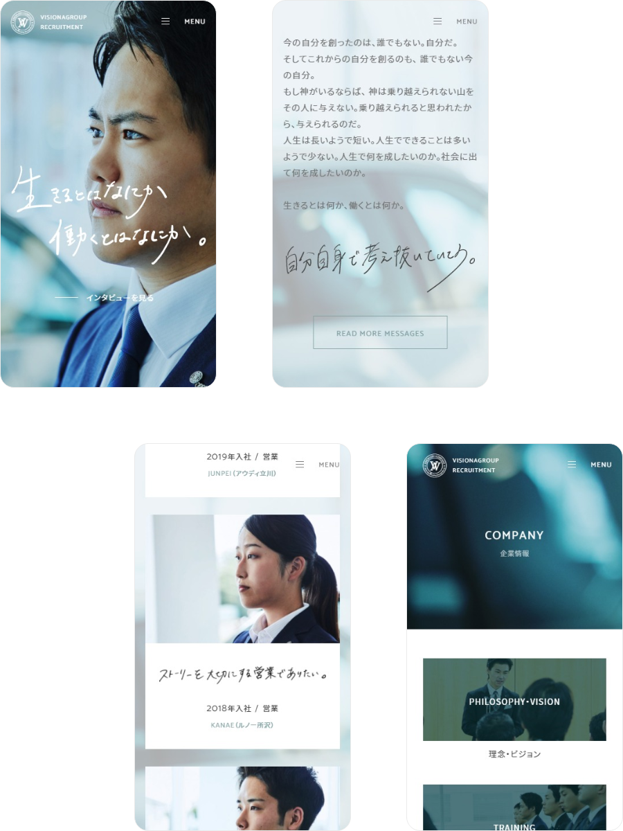 東京都多摩エリア、埼玉県所沢エリアを中心にディーラー事業・中古販売事業などを展開する、ビジョナグループの採用サイトを制作しました。 「生きるとはなにか、働くとはなにか。」というメッセージを、求職者に訴えかけることをデザインで表現しています。