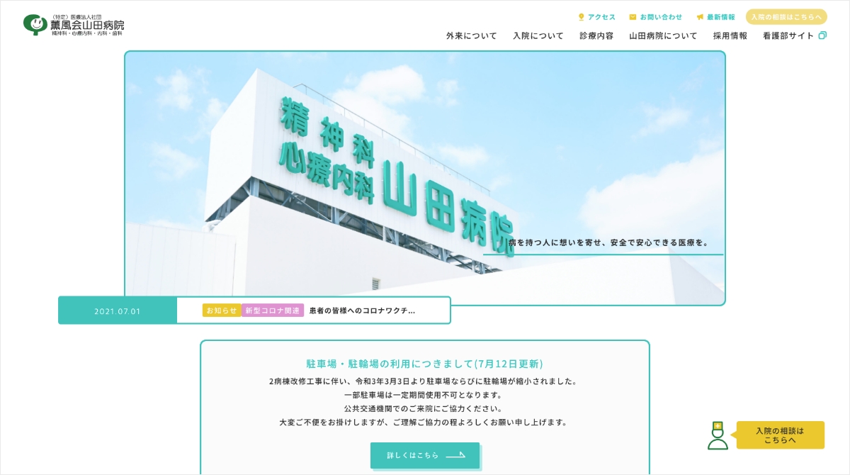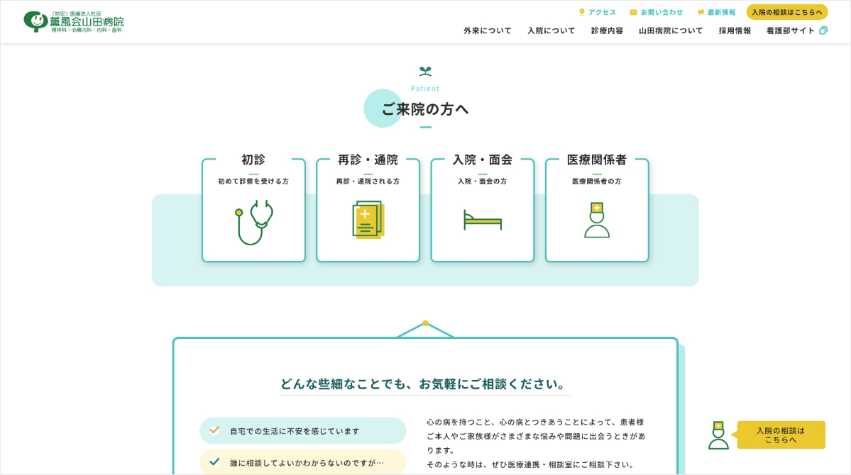 東京都西東京市にある精神科病院、薫風会山田病院様のウェブサイトを制作しました。患者様、採用、医療関係者といったタイプの異なるターゲットユーザーに対して、アクセス解析を基に、ユーザー導線など丁寧に設計しました。