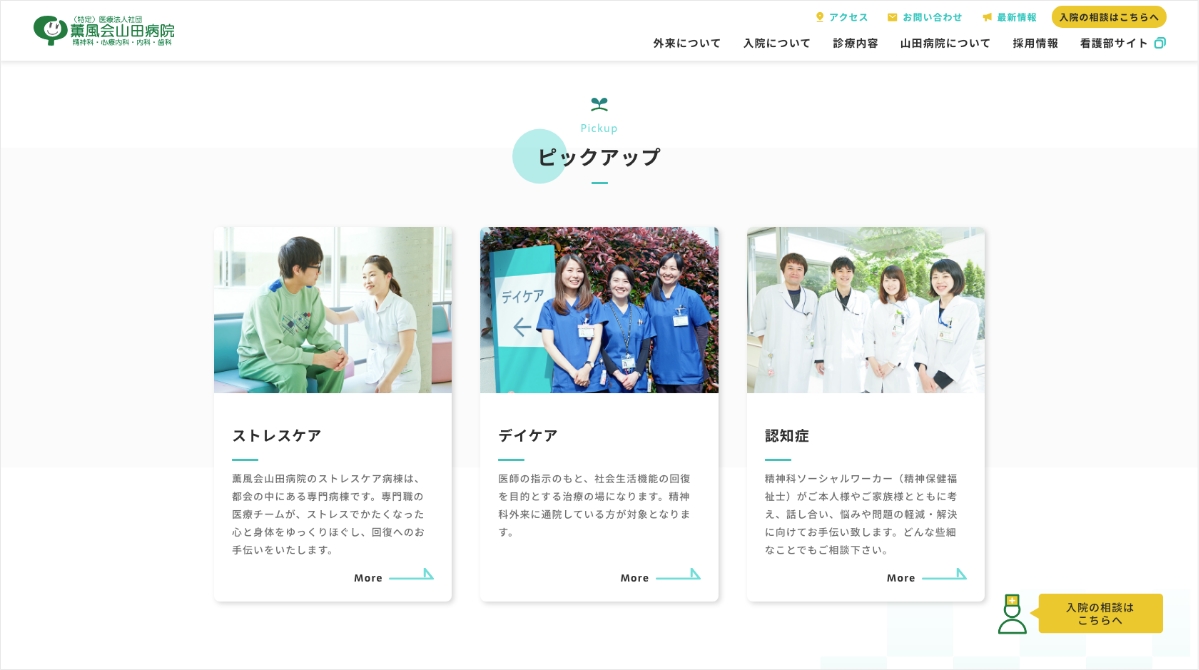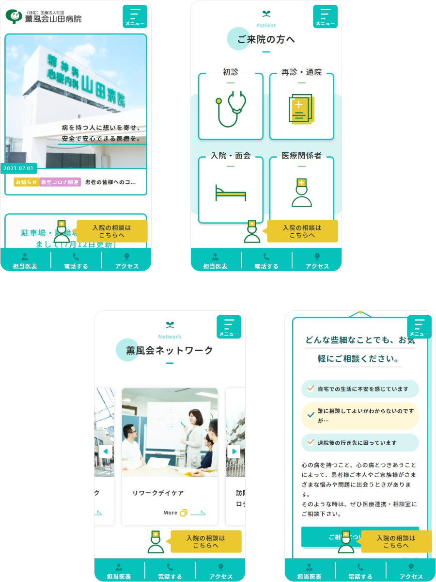 東京都西東京市にある精神科病院、薫風会山田病院様のウェブサイトを制作しました。患者様、採用、医療関係者といったタイプの異なるターゲットユーザーに対して、アクセス解析を基に、ユーザー導線など丁寧に設計しました。